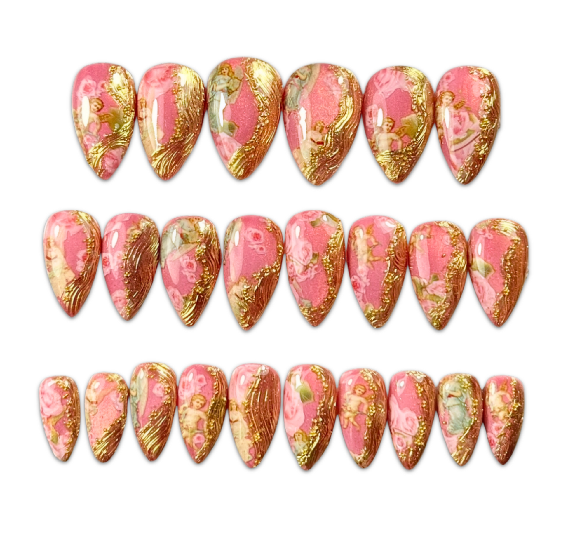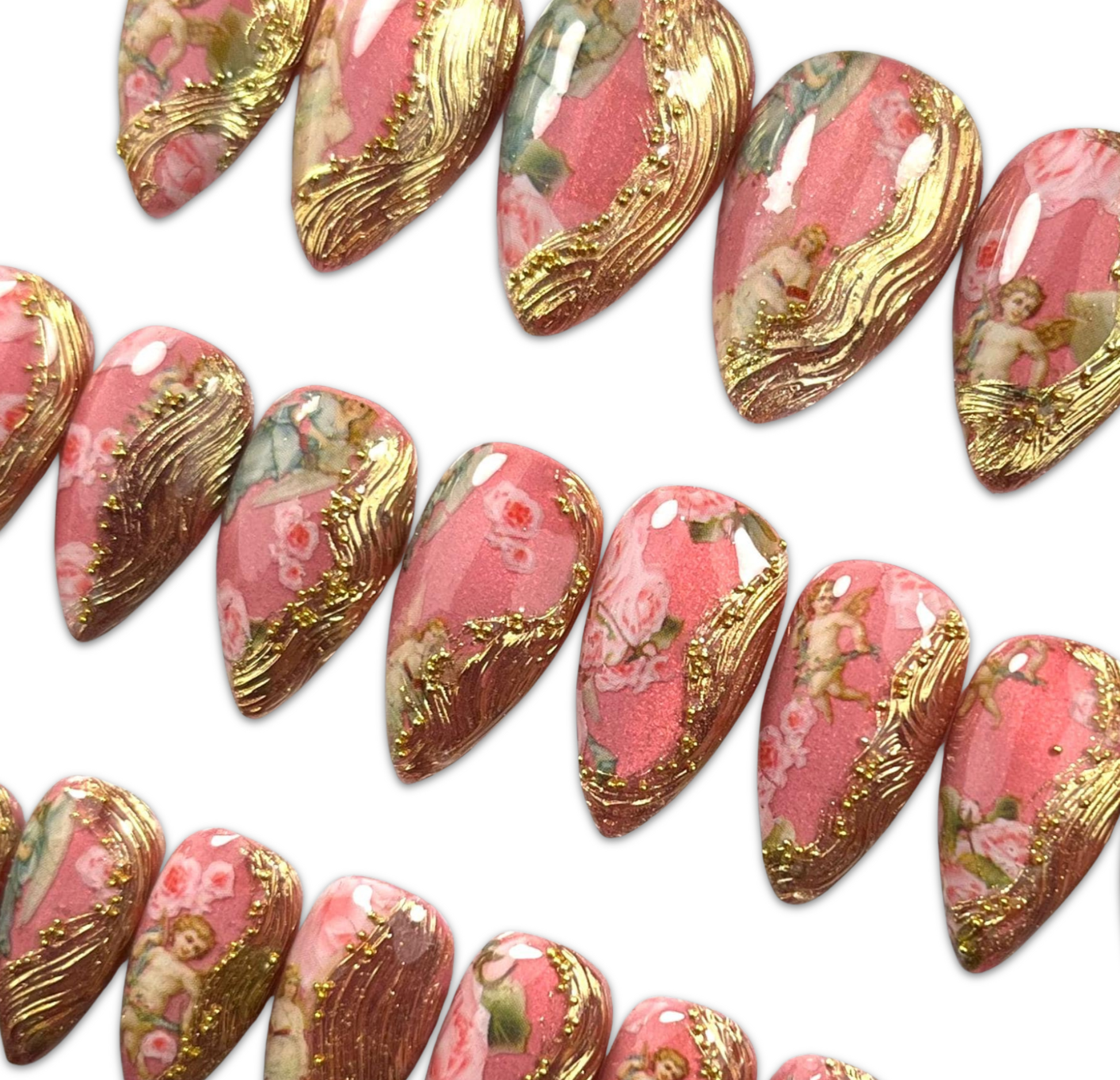 Baroque Rose Press-On Nails – Gold Foil & Pink Floral Wedding Glam (24pcs)