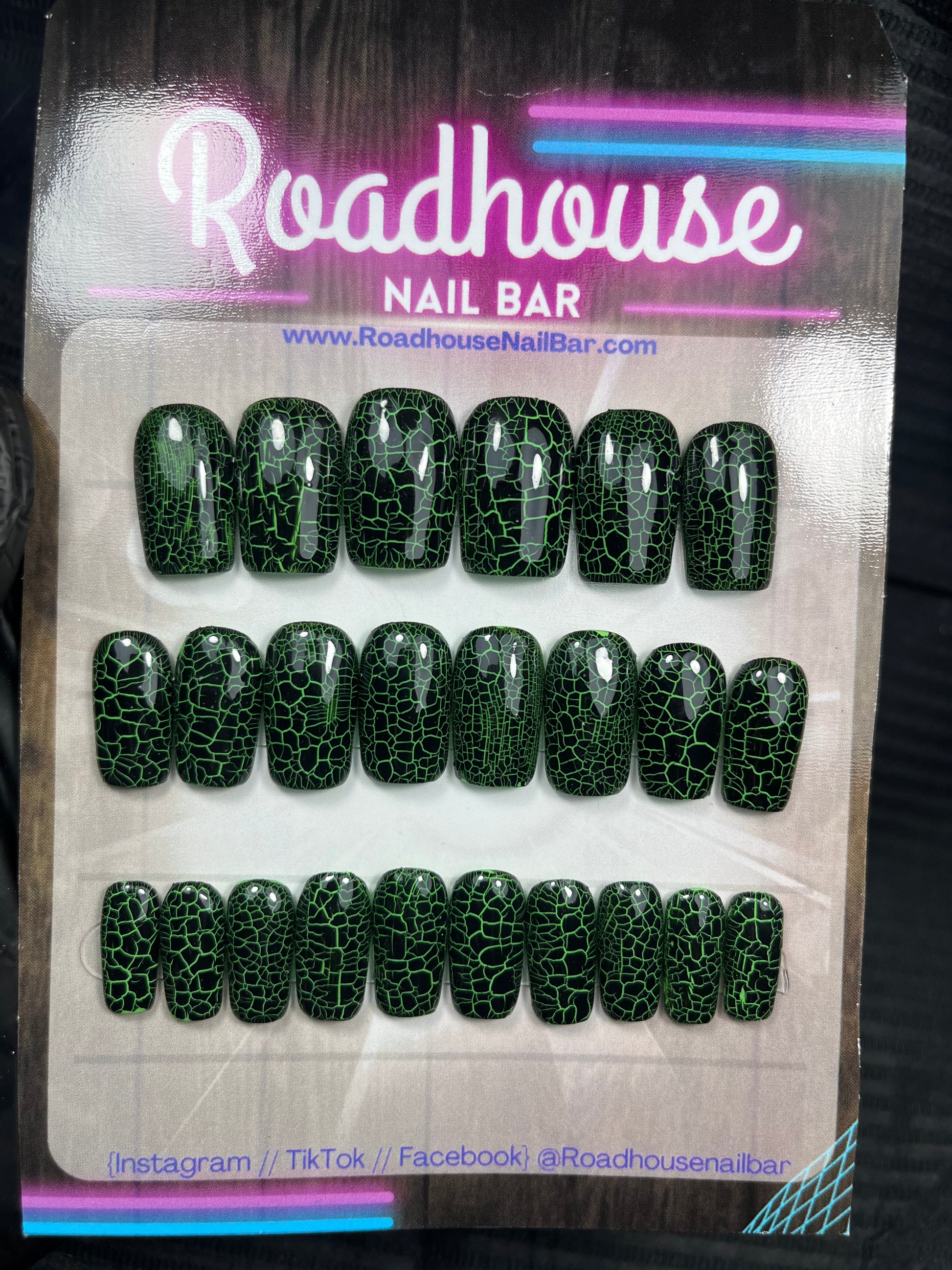 Make a statement with this bold 24-piece set of short square Green Crackle Effect Press-On Nails. Featuring a vivid green base and a sharp black crackle overlay, these nails deliver raw grunge energy with a gothic twist. Eye-catching yet wearable, they’re perfect for alt, punk, and edgy everyday looks — no measuring needed.