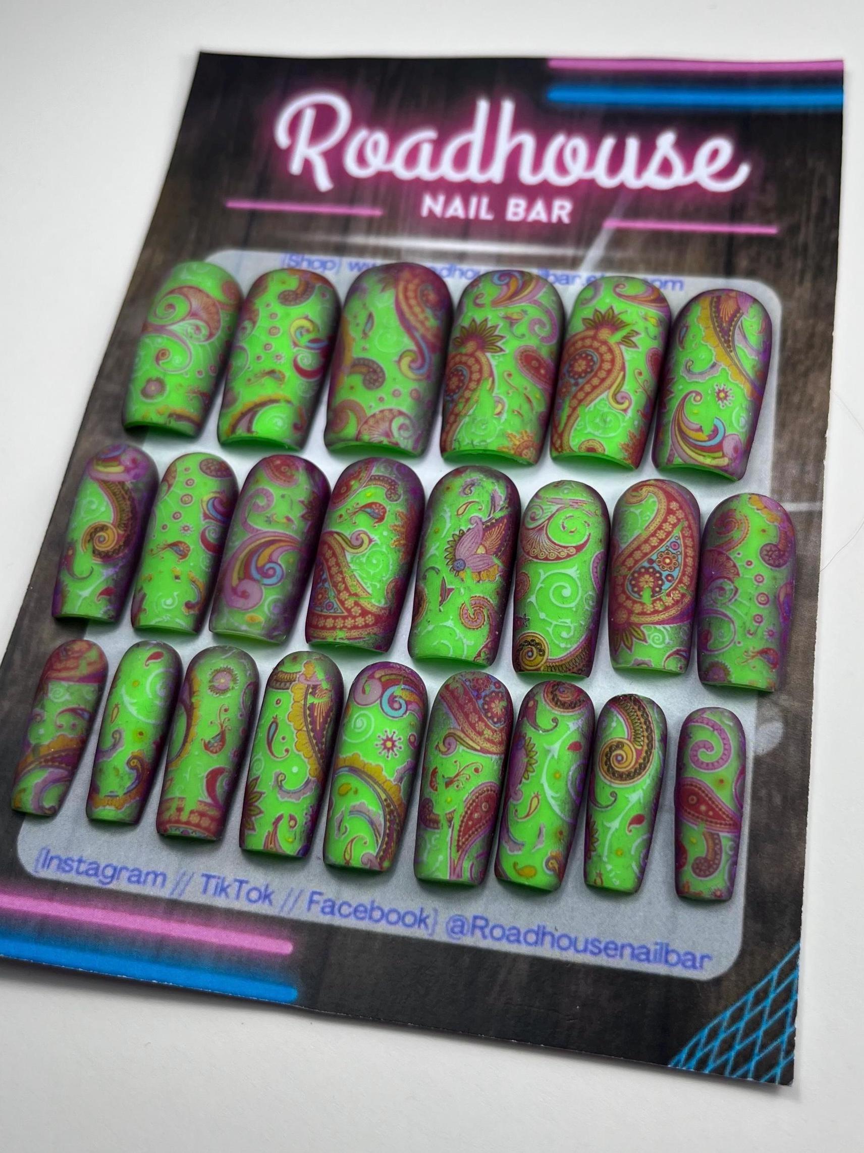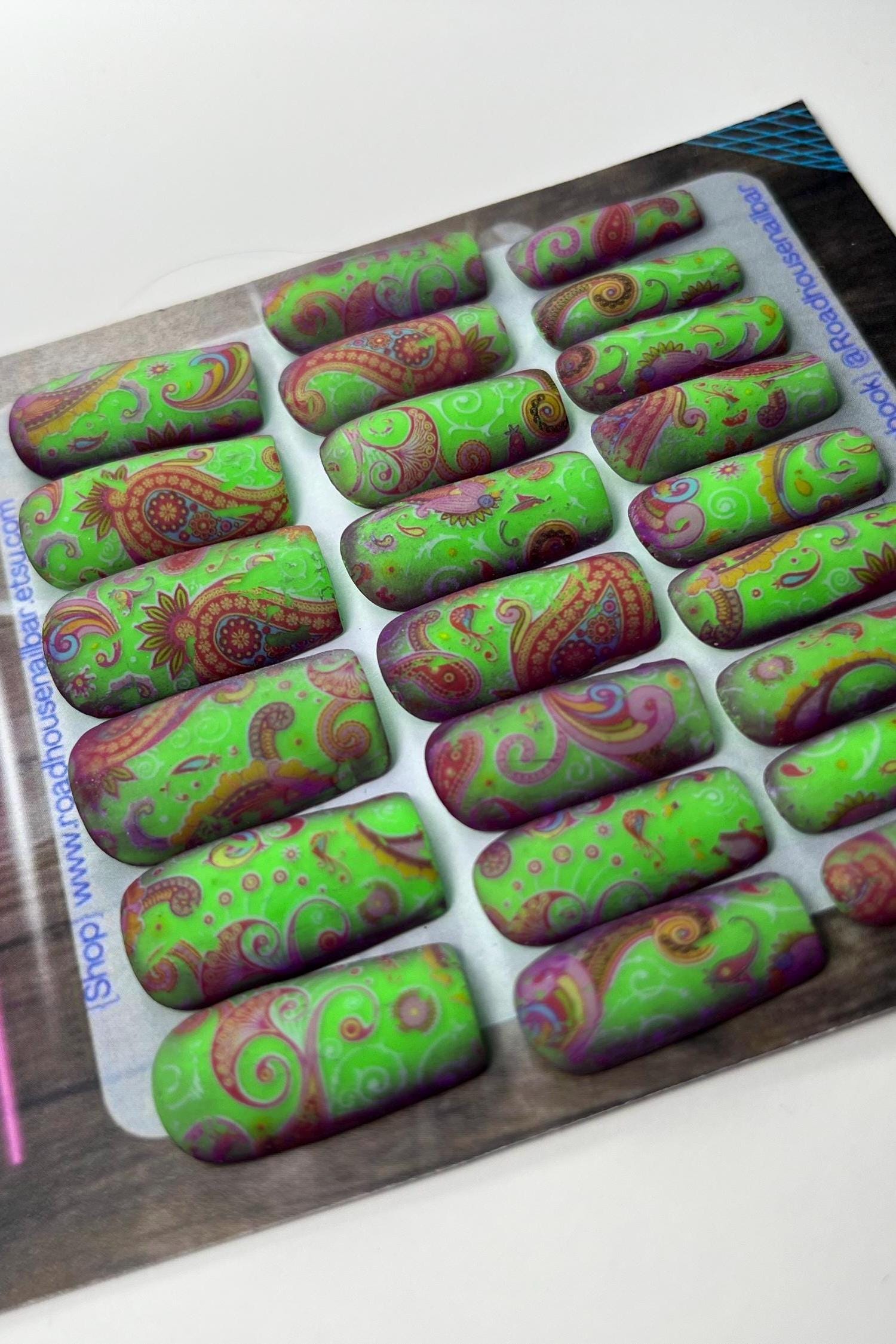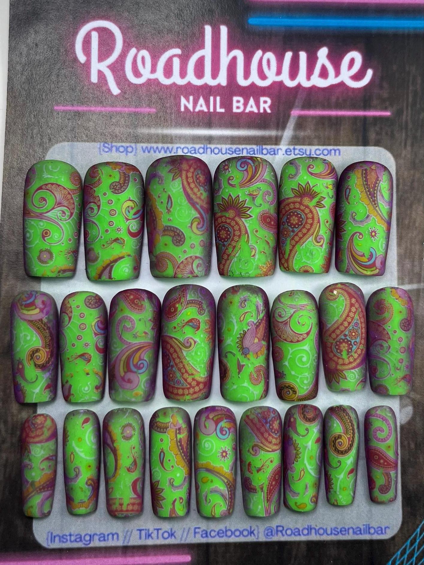 Bright Summer Neon Lime Green Press On Nails | Swirly Pattern Reusable nails | 10pcs - 20pcs Nail Set | Luxury Salon Nails | Matte Funky Photo set is Medium Square Photo taken by : @RoadhouseNailbar ⭐️THIS ITEM INCLUDE 📦FREE SHIPPING⭐️ ⭐️ SIZING ⭐️ 24pcs set - no sizing required. **Now you can have the immediate peace of mind your nails WILL fit because we give it to you in every sizes spanning XS-Large ⭐️ WHAT’S INCLUDED ⭐️ This Kit includes the following: - 10 or 24pcs Handpainted Nail Set - 1 cuticle pusher - 1 nail file - Alcohol wipes to cleanse the nail plate - 10 or 30 HQ sticky tabs (depending on set) 🤷‍♀️😵‍💫Q&A 📍WHAT NAIL SHAPES AND LENGTHS DO YOU OFFER? We offer a variety of nail shapes, including coffin, round, and almond, in lengths ranging from short to long. Each set is clearly labeled with its shape on the product page. Simply provide us with your nail measurements, and we’ll customize the fit for you. 📍HOW SOON MY NAILS SHIP? Shipping times depend on the readiness of the nail set. Items marked as “ready to ship” will be dispatched within 1-2 days. Check the product page for specific shipping time frames. 📍CAN I REQUEST A CUSTOM ORDER? Send me a message with your request and I will get back to you as soon as possible. 📍HOW LONG DO THEY LAST? They can last around 1-3 weeks depending on how well they are applied and looked after. 📍 CAN THEY BE RE-USED? Yes absolutely! With proper care and removal, you can simply add your new set to your collection. * TIP Never use harsh acetones to remove your press-ons as they will damage the artwork and paint.