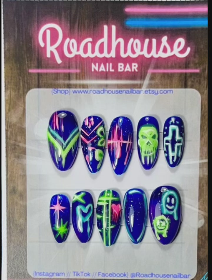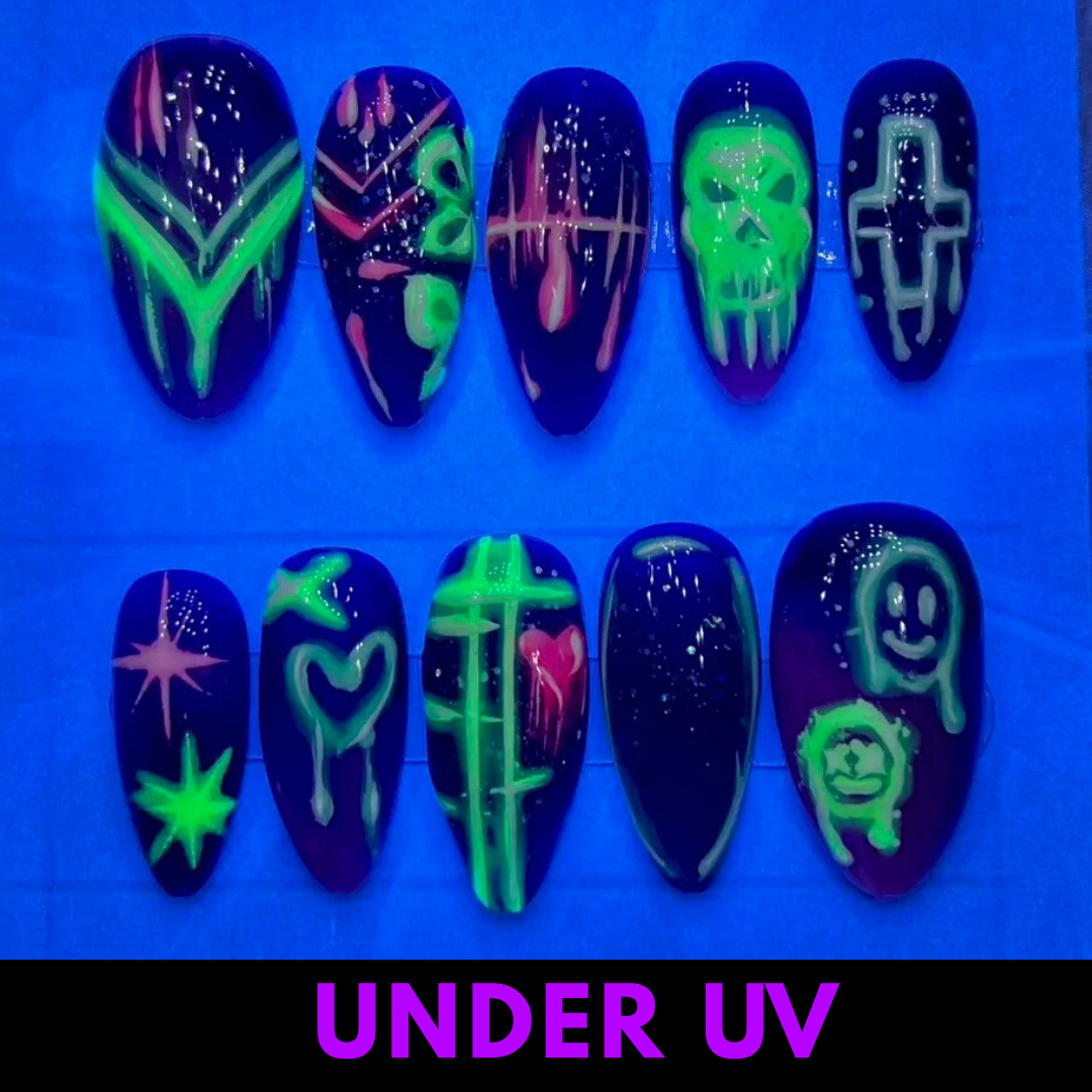 Set of 10 hand-painted press-on nails UV-reactive: glows under blacklight (not glow-in-the-dark)
