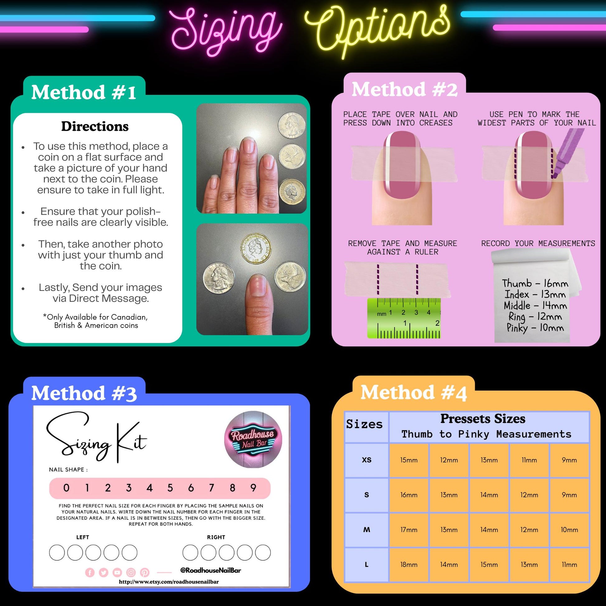 Use our photo guide to measure your nails with tape and a ruler, then select “Custom” and send your measurements.