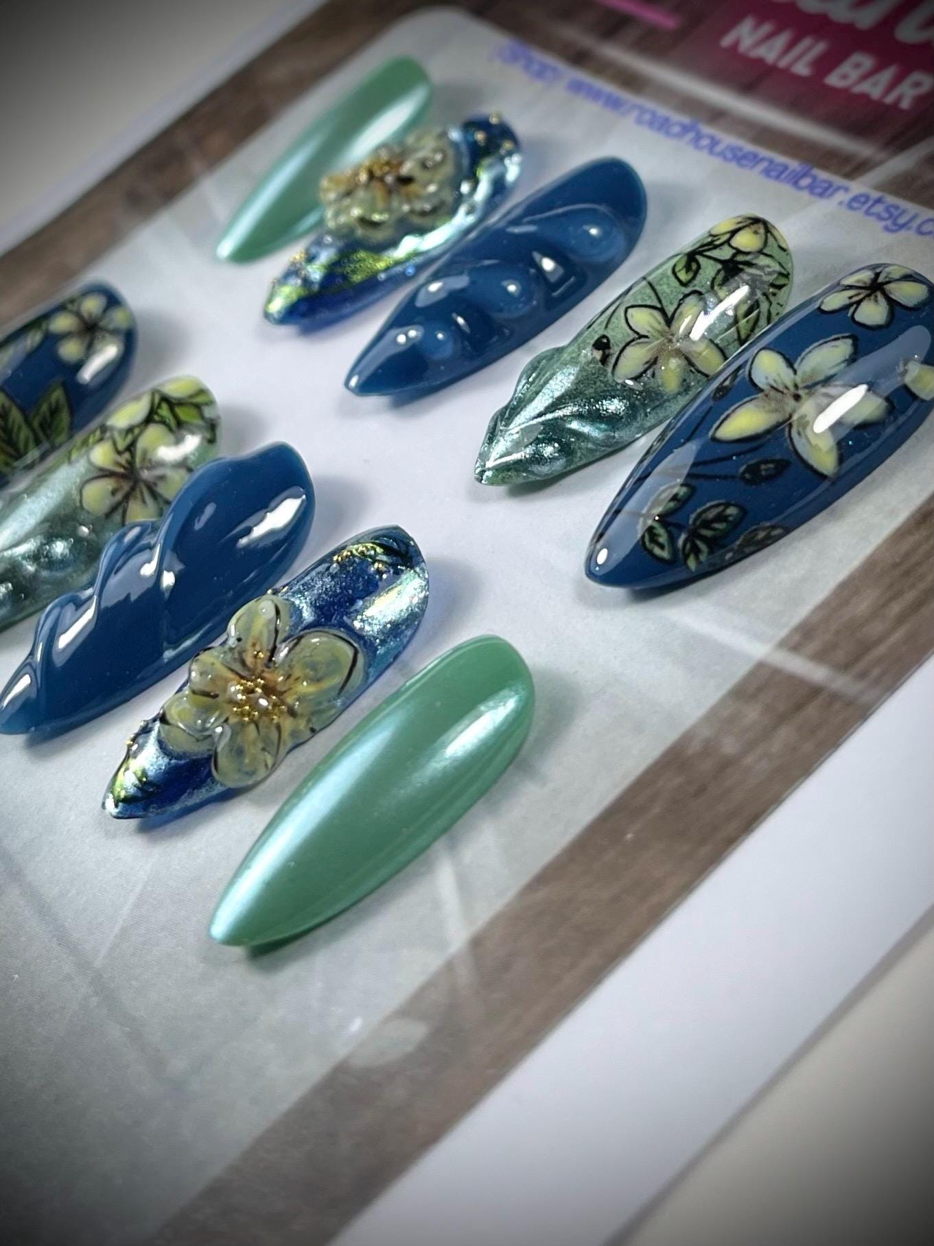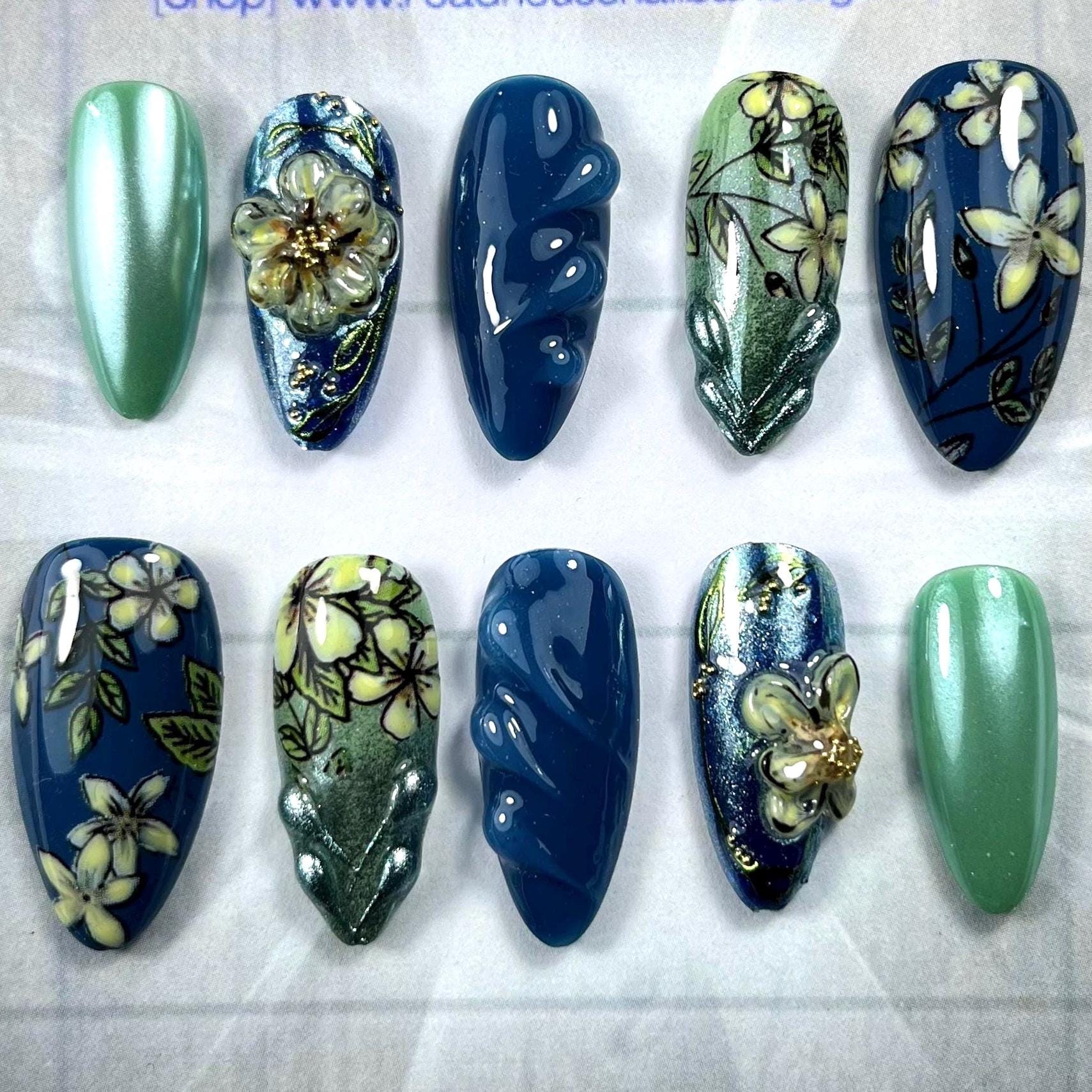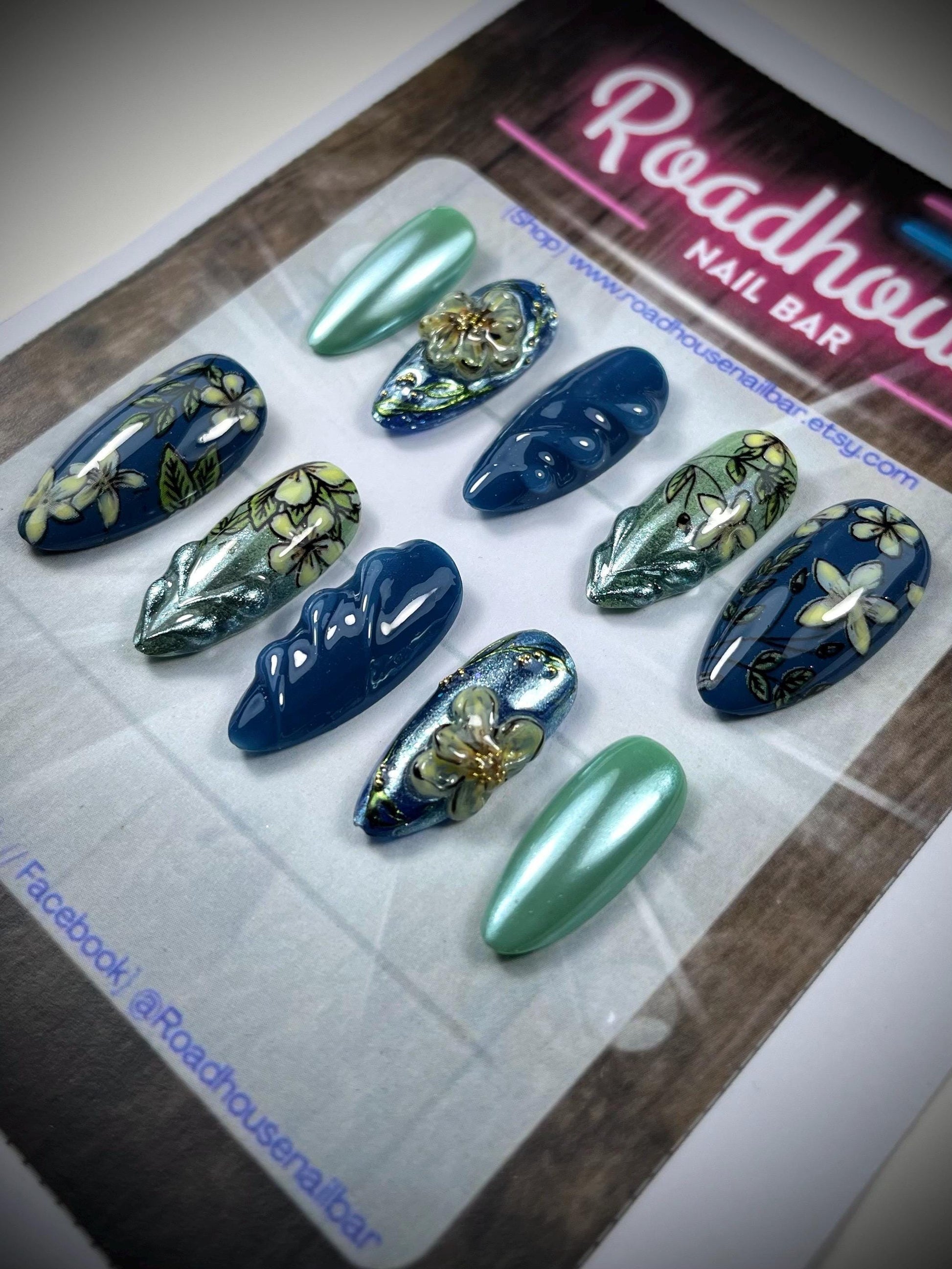 Denim blue, yellow, custard, 3-D Press On Nails | spring floral, blue and green Nails | Full Coverage almond shaped nails | doughnut, glazed ⭐️ SIZING ⭐️ PRE-Sets Available (Check the images on our listing for instructions on how to measure) XS : 15mm, 12mm, 13mm, 11mm, 9mm S: 16mm, 13mm, 14mm, 12mm, 9mm M: 17mm, 13mm, 14mm, 12mm, 10mm L: 18mm, 14mm, 15mm, 13mm, 11mm OR Sizing Kit - which is available for sale at our shop. https://pressngonailshop.etsy.com/listing/1701621245 ⭐️ WHAT’S INCLUDED ⭐️ This Kit includes the following - 10 hand-painted gel full coverage tips in your desired shape and size. - 10 Sticky Tabs - 1 cuticle pusher - 1 nail file - 2 alcohol wipes to cleanse the nail plate ⭐️ CUSTOMISE ⭐️ Want to make some changes like the colour or design? Not a problem! Send me a message with your request and I will get back to you as soon as possible ⭐️ PROCESSING TIME⭐️ As these are handmade to order please allow. please check processing times in shop announcement. ⭐️ CAN THEY BE RE-USED? ⭐️ Yes absolutely! With proper care and removal, you can simply add your new set to your collection Or simply use sticky tabs for easy removal . * TIP Never use harsh acetones to remove your pressons as they will damage the artwork and paint. ⭐️ HOW LONG DO THEY LAST? ⭐️ They can last around 1-3 weeks depending on your preferred application and looked after. For 3-4 week wearability nail glue is preferred.