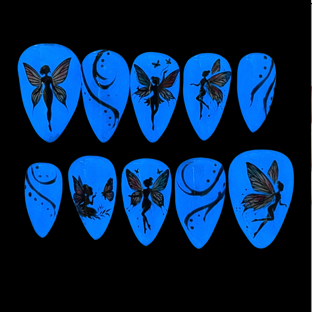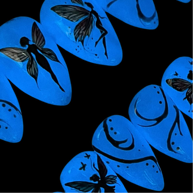 Float into a magical daydream with these luminescent blue press-on nails, glowing with whimsical fairy energy. With delicate shimmer by day and a radiant glow by night, this enchanted 10-piece set is hand-painted just for you and tailored to your perfect fit. Light, luminous, and totally spellbinding!