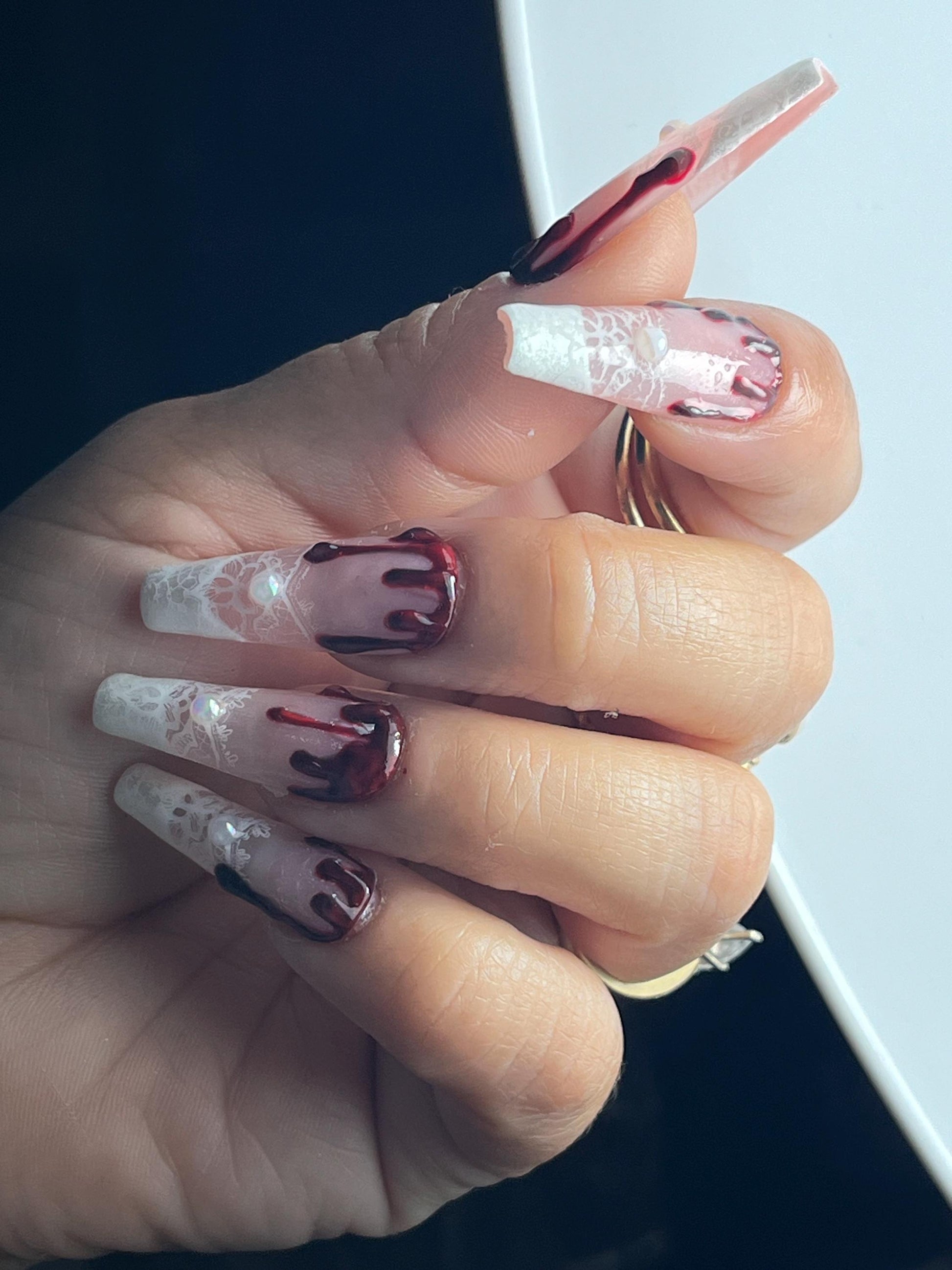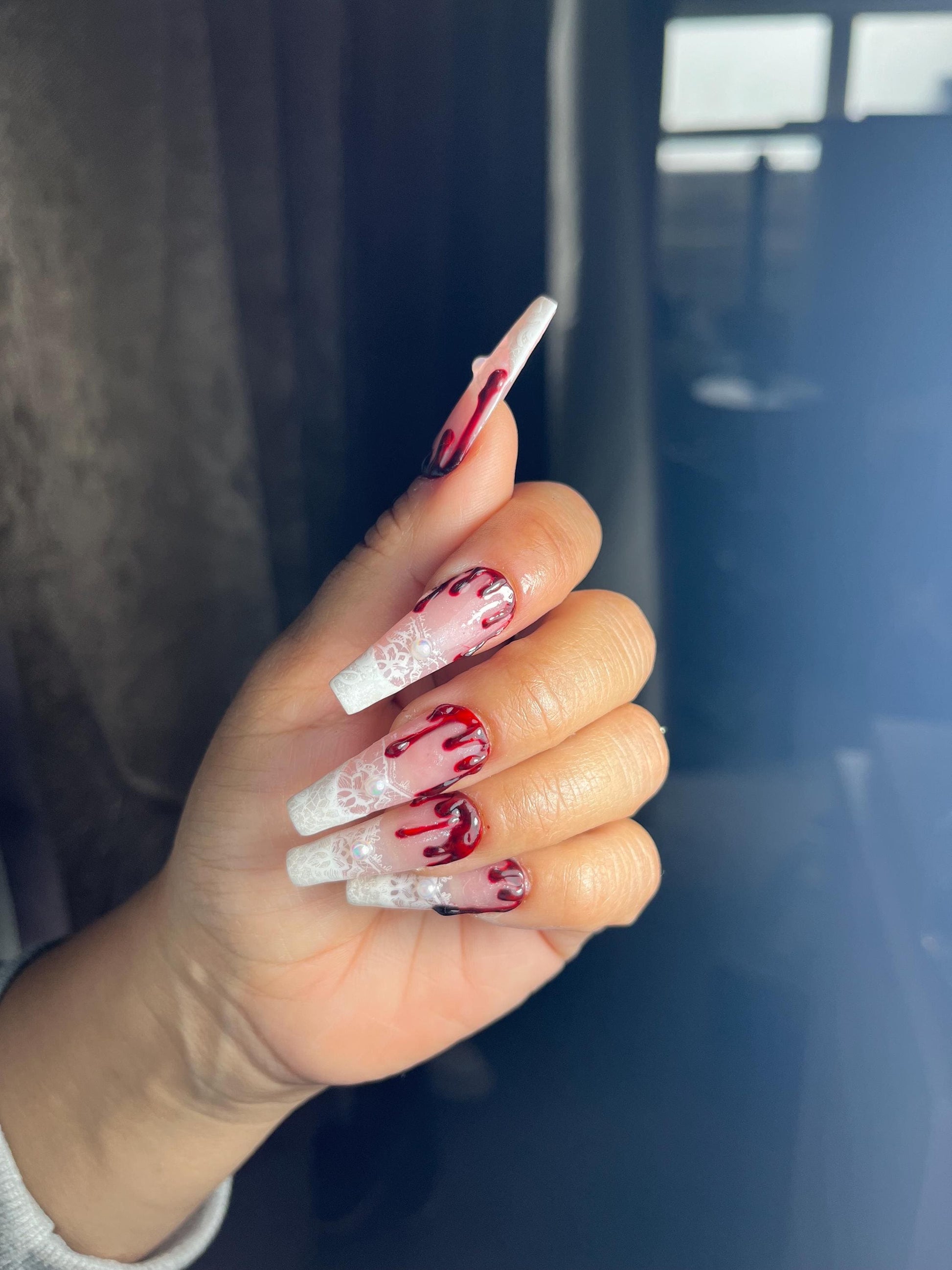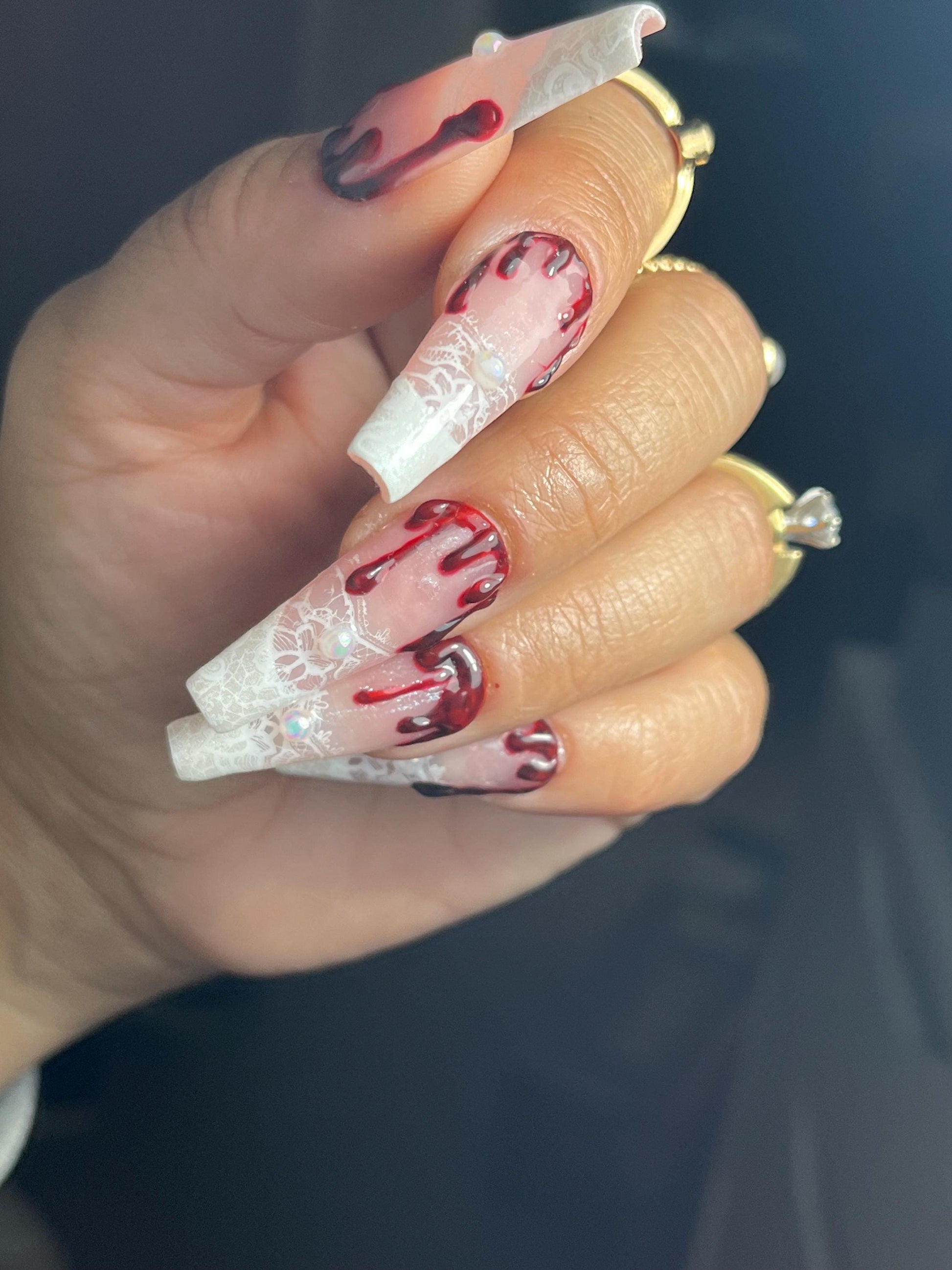 Halloween Gothic Bride Press On Nails for perhaps a gothic wedding or Divorce Glue On Nails vampire Halloween Full Coverage Nails, Instant Manicure. ⭐️ SIZING ⭐️ PRE-Sets Available (Check the images on our listing for instructions on how to measure) XS : 15mm, 12mm, 13mm, 11mm, 9mm S: 16mm, 13mm, 14mm, 12mm, 9mm M: 17mm, 13mm, 14mm, 12mm, 10mm L: 18mm, 14mm, 15mm, 13mm, 11mm OR Sizing Kit - which is available for sale at our shop. https://pressngonailshop.etsy.com/listing/1701621245 ⭐️ WHAT’S INCLUDED ⭐️ This Kit includes the following - 10 hand-painted gel full coverage tips in your desired shape and size. - 1 cuticle pusher - 1 nail file - 1 alcohol wipe to cleanse the nail plate *Please specify if you would like sticky tabs instead of nail glue ⭐️ CUSTOMISE ⭐️ Want to make some changes like the colour or design? Not a problem! Send me a message with your request and I will get back to you as soon as possible ⭐️ PROCESSING TIME⭐️ As these are handmade to order please allow 5-7 for processing your set. You want quality over speed. Too many times people received them within 7 days only to find their set was rushed and had an unprofessional sloppy paint application. ⭐️ CAN THEY BE RE-USED? ⭐️ Yes absolutely! With proper care and removal, you can simply add your new set to your collection. There are many wonderful videos online and TikTok on creating a "Pop Off" method of removal. Or simply use sticky tabs. * TIP Never use harsh acetones to remove your pressons as they will damage the artwork and paint. ⭐️ HOW LONG DO THEY LAST? ⭐️ They can last around 1-3 weeks depending on how well they are applied and looked after.