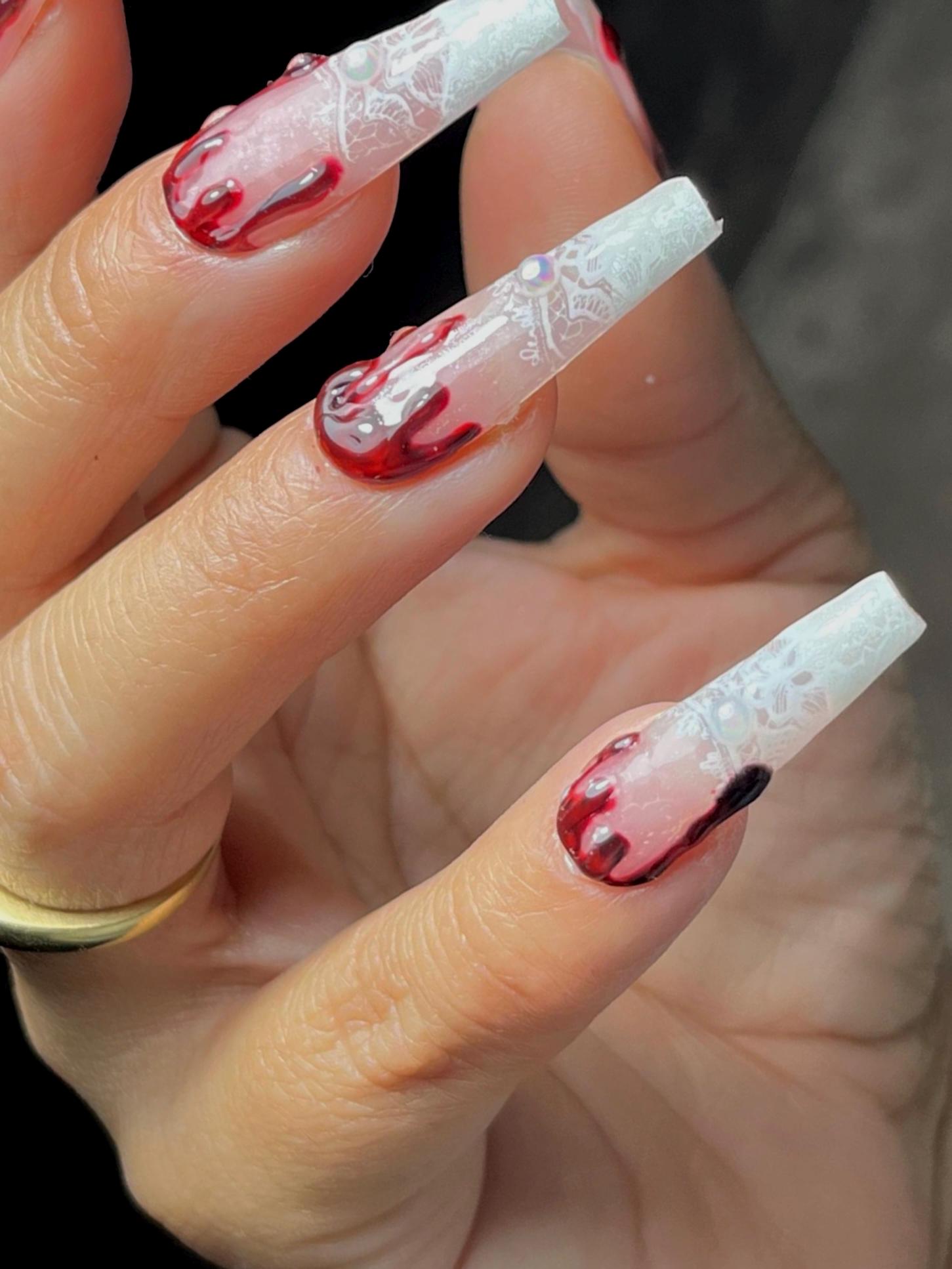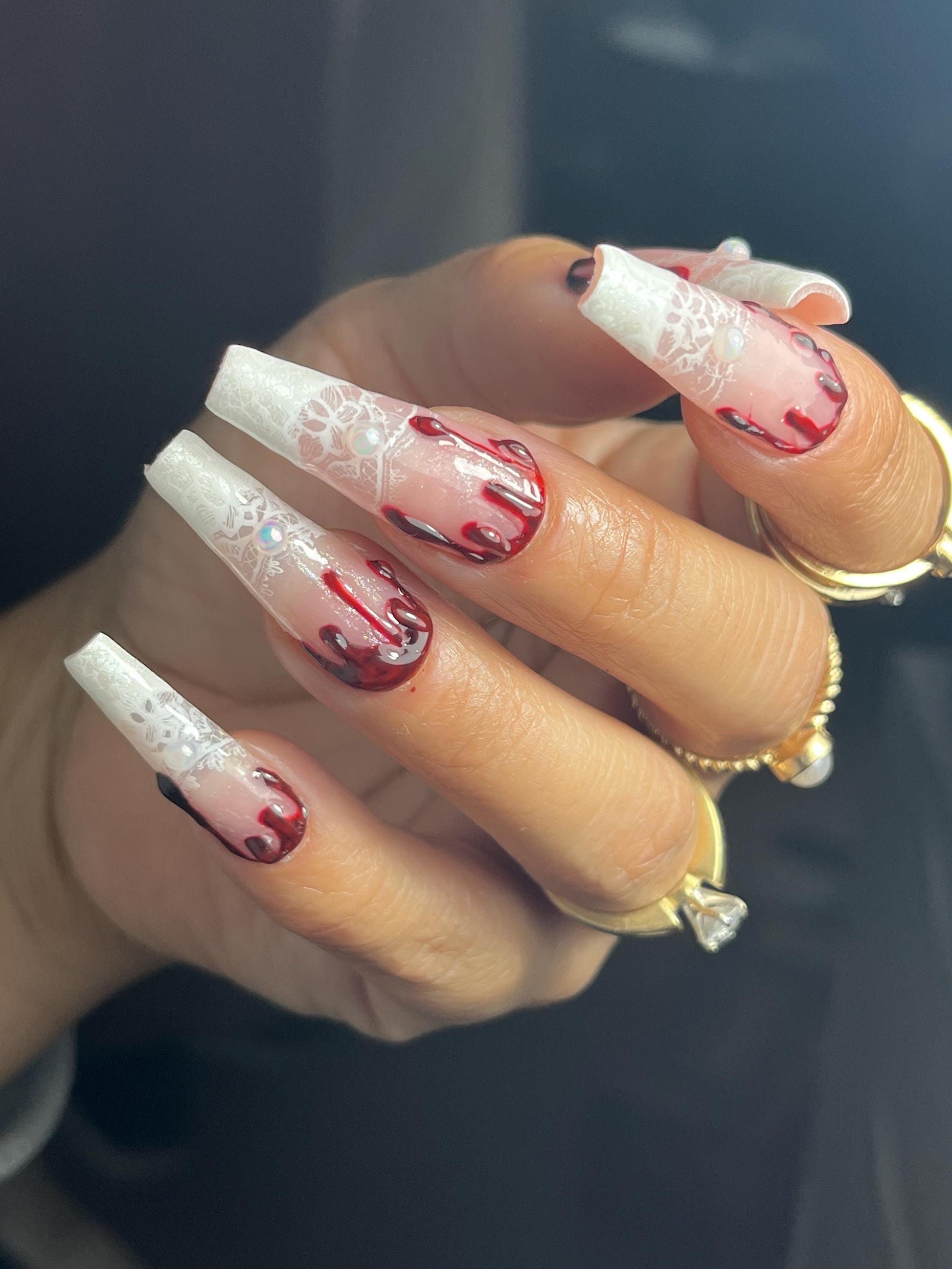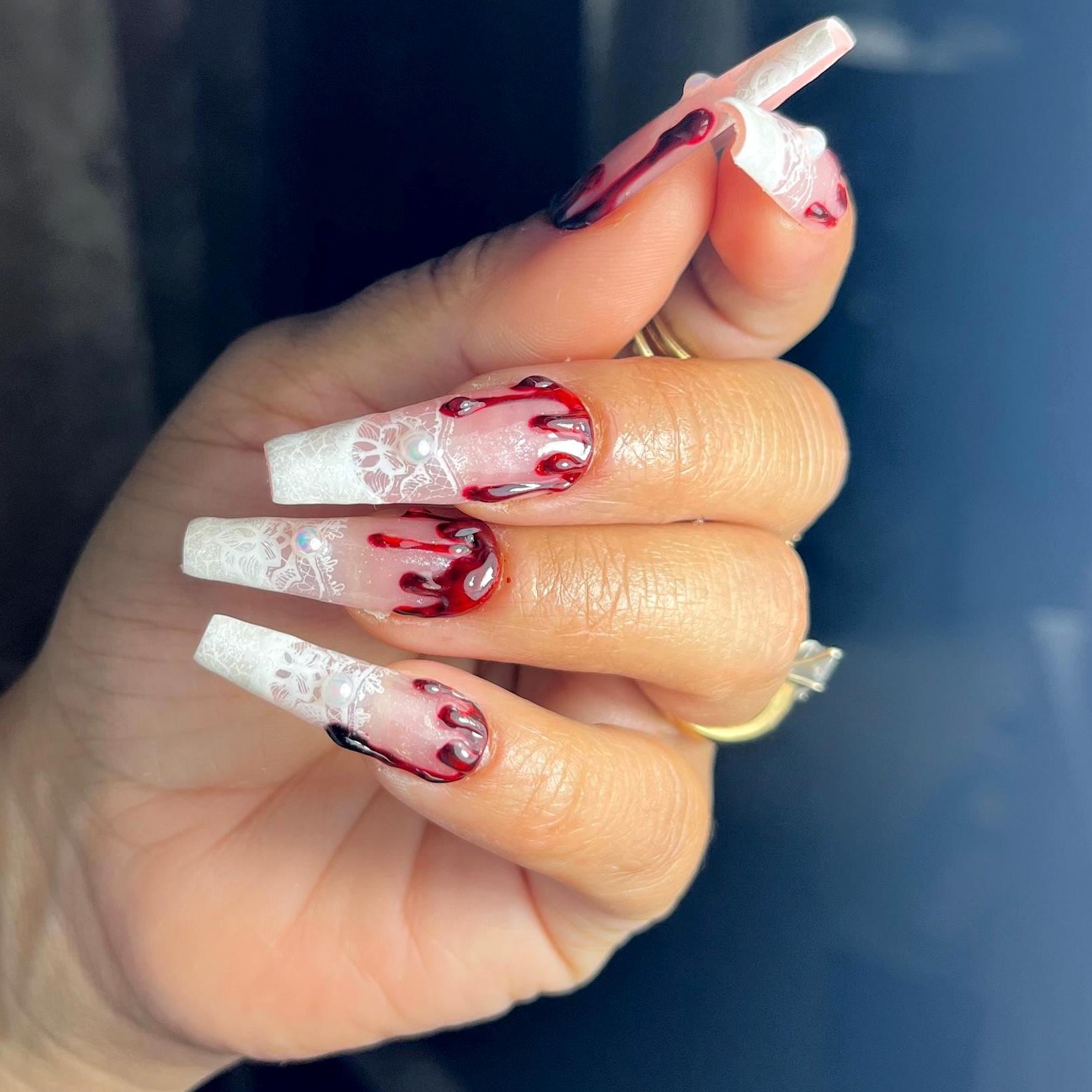 Halloween Gothic Bride Press On Nails for perhaps a gothic wedding or Divorce Glue On Nails vampire Halloween Full Coverage Nails, Instant Manicure. ⭐️ SIZING ⭐️ PRE-Sets Available (Check the images on our listing for instructions on how to measure) XS : 15mm, 12mm, 13mm, 11mm, 9mm S: 16mm, 13mm, 14mm, 12mm, 9mm M: 17mm, 13mm, 14mm, 12mm, 10mm L: 18mm, 14mm, 15mm, 13mm, 11mm OR Sizing Kit - which is available for sale at our shop. https://pressngonailshop.etsy.com/listing/1701621245 ⭐️ WHAT’S INCLUDED ⭐️ This Kit includes the following - 10 hand-painted gel full coverage tips in your desired shape and size. - 1 cuticle pusher - 1 nail file - 1 alcohol wipe to cleanse the nail plate *Please specify if you would like sticky tabs instead of nail glue ⭐️ CUSTOMISE ⭐️ Want to make some changes like the colour or design? Not a problem! Send me a message with your request and I will get back to you as soon as possible ⭐️ PROCESSING TIME⭐️ As these are handmade to order please allow 5-7 for processing your set. You want quality over speed. Too many times people received them within 7 days only to find their set was rushed and had an unprofessional sloppy paint application. ⭐️ CAN THEY BE RE-USED? ⭐️ Yes absolutely! With proper care and removal, you can simply add your new set to your collection. There are many wonderful videos online and TikTok on creating a "Pop Off" method of removal. Or simply use sticky tabs. * TIP Never use harsh acetones to remove your pressons as they will damage the artwork and paint. ⭐️ HOW LONG DO THEY LAST? ⭐️ They can last around 1-3 weeks depending on how well they are applied and looked after.