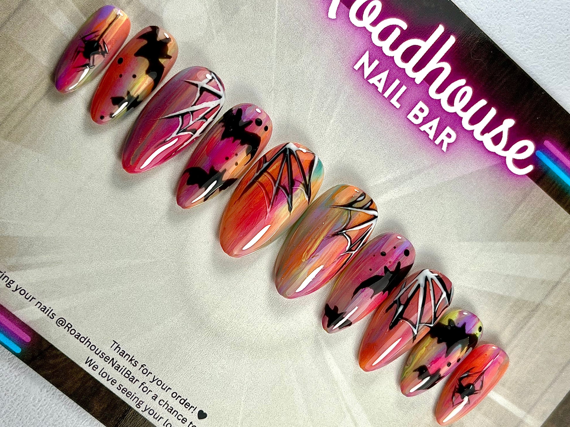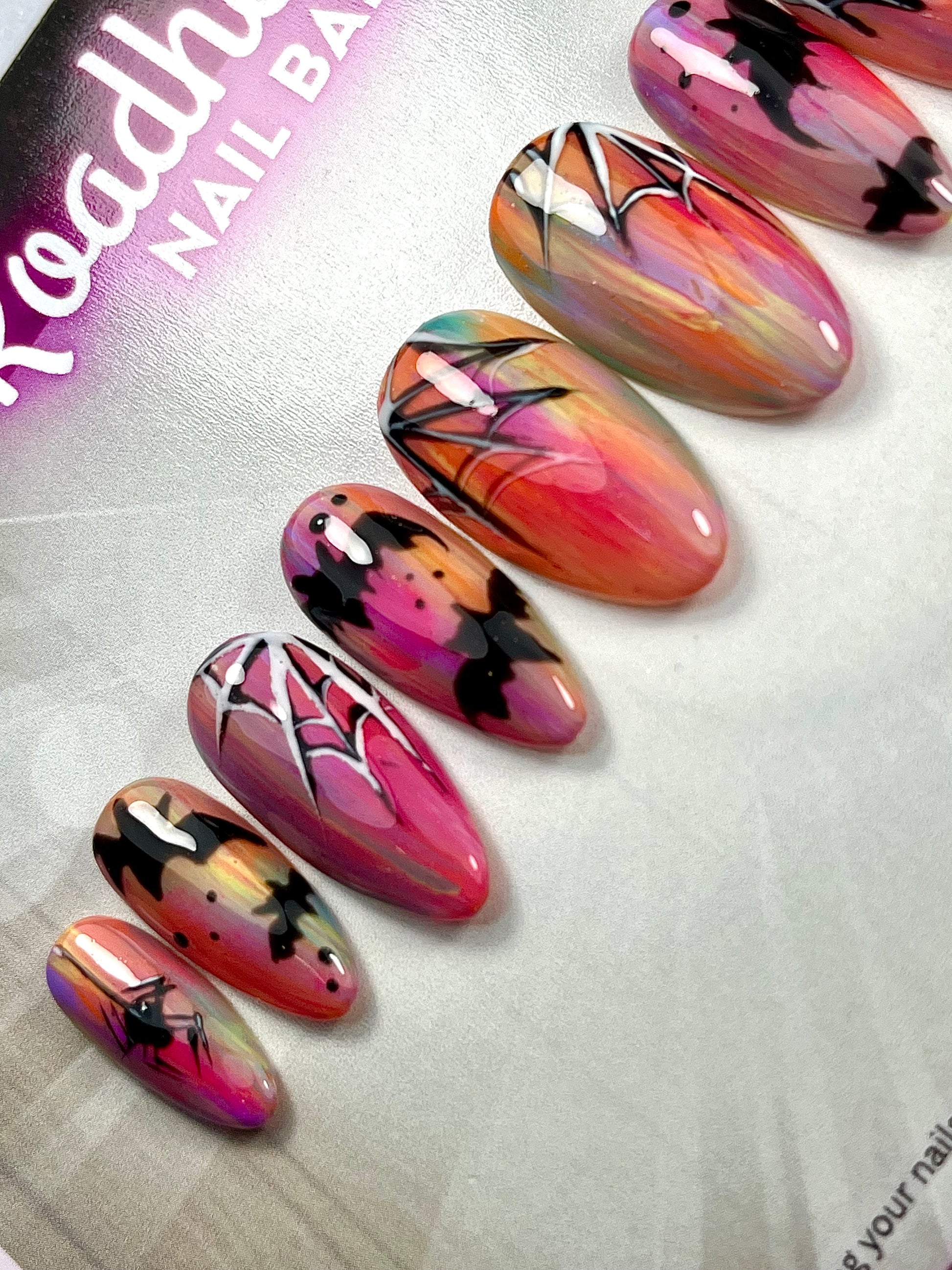 Elevate your Halloween look with these hand-painted Gothic ombre press-on nails, featuring a glowing sunset gradient, elegantly detailed bats, and spider-web accents — all reusable and proudly crafted in the UK.