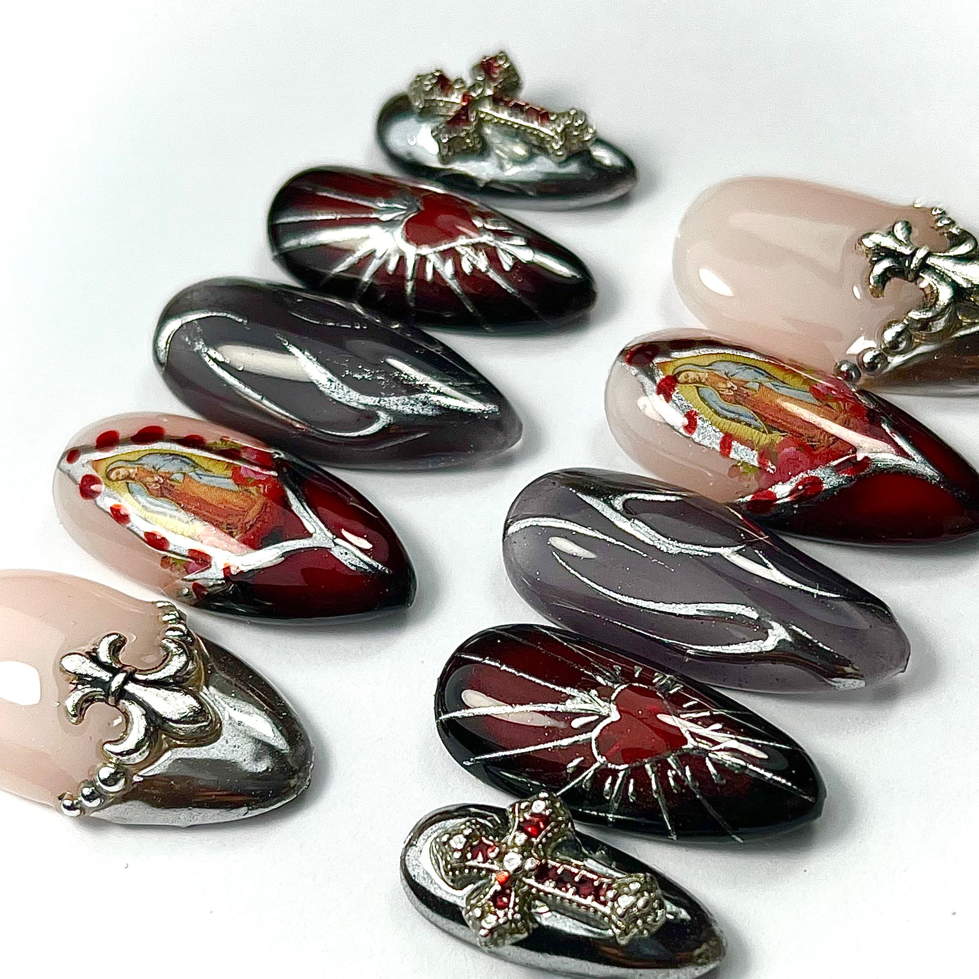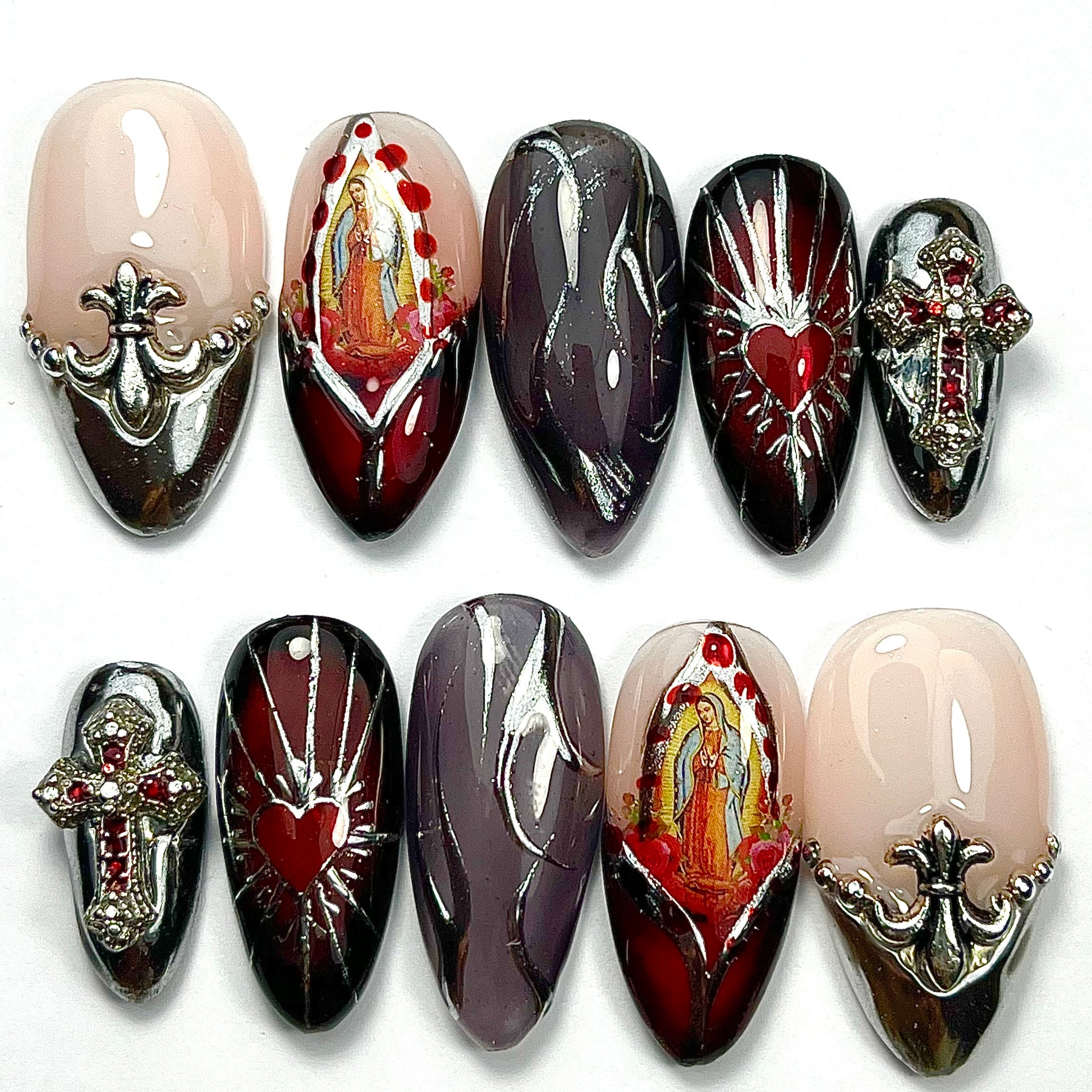 Gothic Religious Press-On Nails – Sacred Heart, Virgin Mary & Cross Charms (10pc Custom Set)