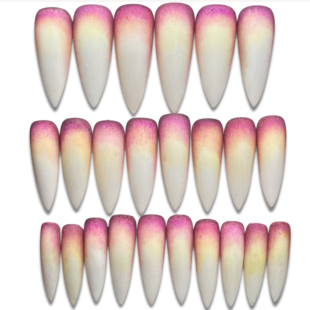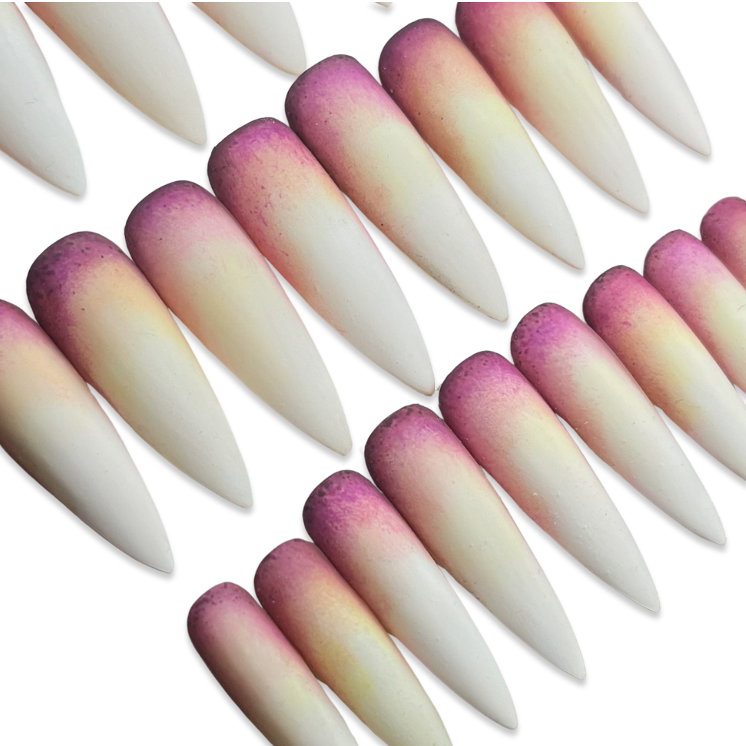Make a deadly glam statement with this 24-piece press-on nail set in dramatic long stiletto shape. Featuring a smooth ombré blend from blood plum to soft ivory, this set channels gothic romance and vampiric elegance. Inspired by Nosferatu and twilight skies, these nails are for the dark-hearted dreamers and sunset sirens.