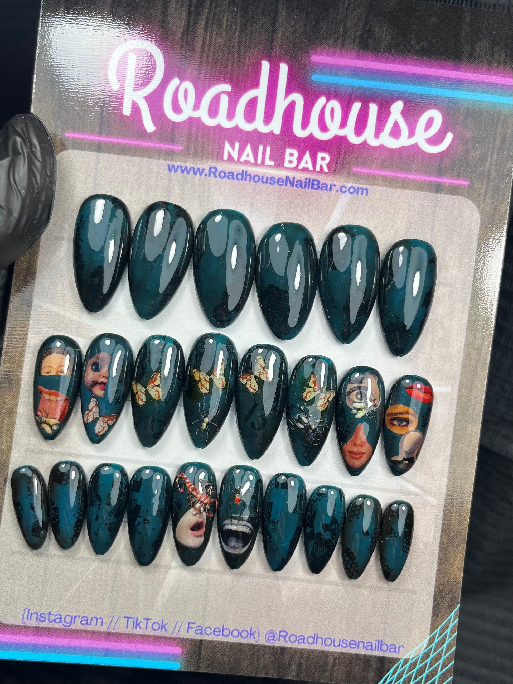 Strange, surreal, and striking — this 24-piece set of medium almond press-on nails features a dark green base adorned with eerie motifs of eyes, mouths, and butterflies. Finished with a black vignette around each nail, this set brings an artful sense of the uncanny to your fingertips. Inspired by gothic surrealism and vintage oddities collections, these nails are perfect for lovers of the weird and wonderful.