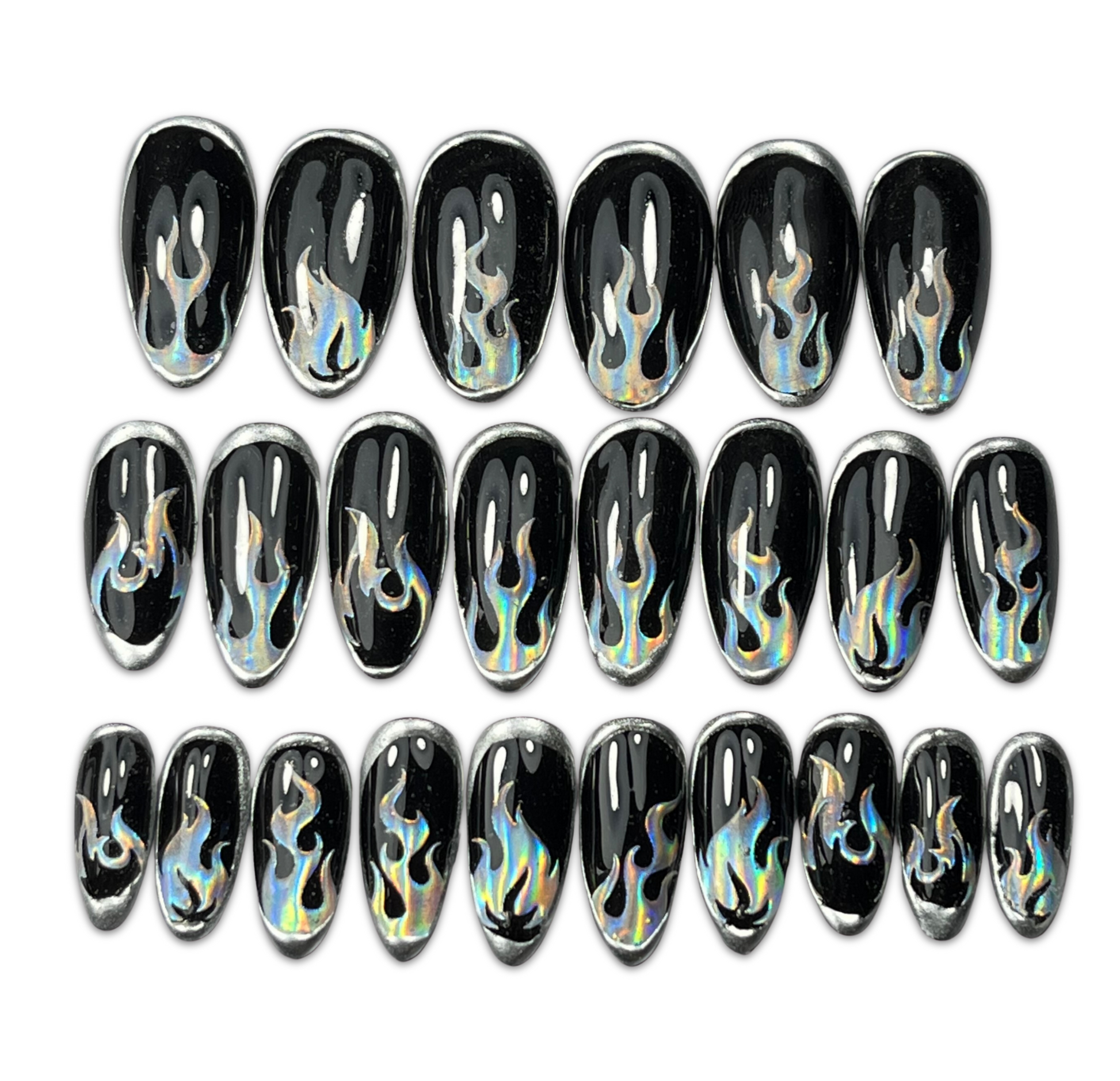 Turn up the heat with this 24-piece set of Black Chrome Flame Press-On Nails. Featuring a sleek black base with hand-painted chrome and holographic flames, these nails shimmer with fiery rainbow reflections that catch the light with every move. Whether you're channeling rockstar energy, gothic glam, or alt-girl attitude, these nails deliver a bold and reusable look straight out of a fantasy stage show.