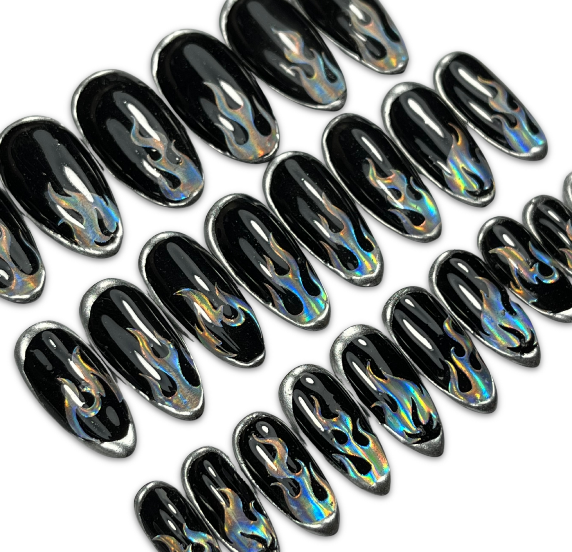 Black Chrome Flame Press-On Nails – Holographic Fire Gothic Nail Set (24pcs)